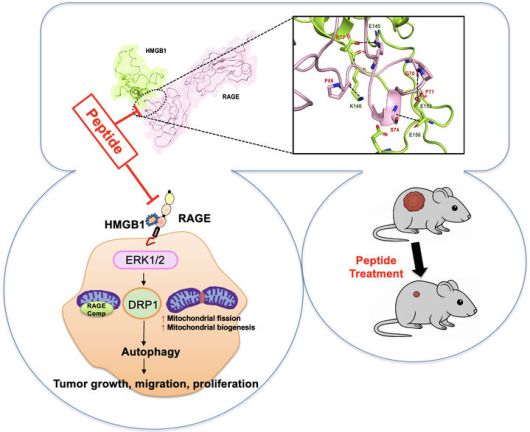 이 결합을 차단하는 새로운 펩타이드는 당 독소 수용체인 RAGE와 경쟁적으로 결합해 기존 HMGB1-RAGE 복합체 형성을 저해하고 암세포에서 활성화되는 ERK1/2(Extracellular signal-regulated kinase)?Drp1(Dynamin-related protein 1) 신호전달 경로를 억제해 자가포식(autophagy), 세포 증식 및 이동을 현저히 차단하는 것으로 나타났다는 설명이다.