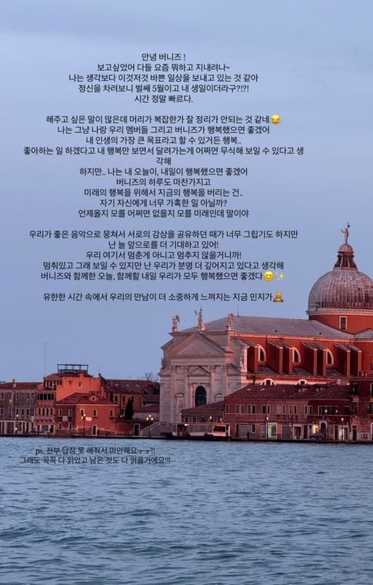 끝으로 민지는 생일 카페에서 만난 버니즈를 떠올렸다. "버니즈와 함께한 오늘, 함께할 내일 우리가 모두 행복했으면 좋겠다"고 바랐다.