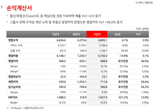 KT는 한국채택국제회계기준(K-IFRS) 연결기준 2025년 1분기 매출액과 영업이익을 각각 6조8451억원과 6888억원으로 집계했다고 9일 밝혔다.