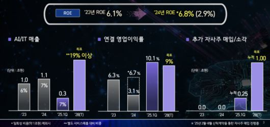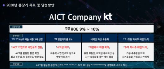 KT는 기업가치제고 계획 등을 소개했다. 2028년 연결기준 자기자본이익률(ROE) 9~10%를 제시했다. AI 및 IT 매출 비중 3배 성장 연결 영업이익률 9% 부동산 및 비핵심 자산 유동화 누적 1조원 규모 자사주 매입 및 소각 등을 제시했다. 2028년은 차기 KT 대표 임기가 끝나는 해다.