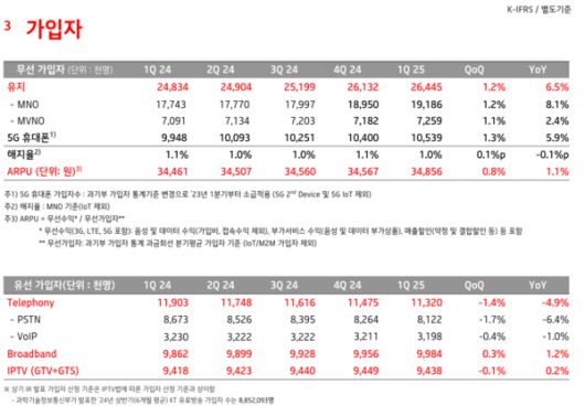 무선 사업 매출액은 1조7531억원이다. 전기대비 2.1% 전년동기대비 1.0% 성장했다. 무선 가입자는 2644만5000명이다. 알뜰폰(MVNO, 이동전화재판매) 725만9000명 포함이다. 전기대비 31만3000명 확대했다.