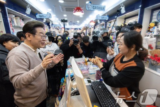 (경주=뉴스1) 이재명 기자 = 3차 경청투어에 나선 이재명 더불어민주당 대통령 후보가 9일 오전 경북 경주시 한 아파트 단지에 위치한 문구점을 찾아 상인과 대화를 하고 있다. 2025.5.9/뉴스12expulsion@news1.krCopyright ⓒ 뉴스1. All rights reserved. 무단 전재 및 재배포, AI학습 이용 금지.