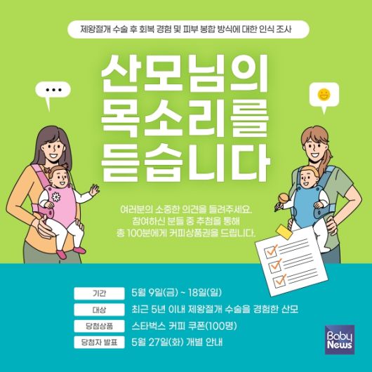 베이비뉴스는 최근 5년 이내 제왕절개 수술을 한 산모들을 대상으로 수술 후 회복 경험, 피부 봉합 방식 등과 관련한 인식을 조사하기 위해 9일부터 18일까지 설문조사를 실시한다고 9일 밝혔다.