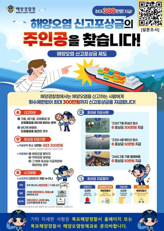 목포해양경찰서는 해양환경을 보호하고 오염사고 예방 및 신속한 사고대응으로 해양오염 피해를 줄이기 위한 '해양오염 신고포상금 제도'를 운영 한다고 9일 밝혔다.