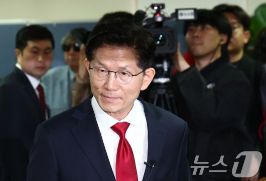(서울=뉴스1) 김민지 기자 = 김문수 국민의힘 대통령 후보가 9일 오전 서울 여의도 선거사무소에서 북핵 억제력 강화 공약 발표를 하기 위해 입장하고 있다. 2025.5.9/뉴스1
