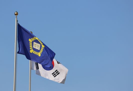 더불어민주당 이재명 대선 후보의 공직선거법 사건에 대한 대법원 전원합의체 선고를 하루 앞둔 30일 서울 서초구 대법원의 법원 깃발과 태극기가 바람에 펄럭이고 있다. 연합뉴스 |