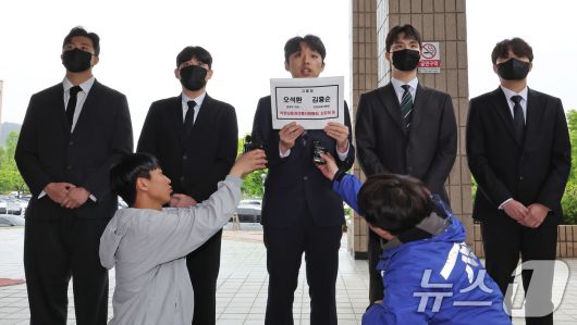 (서울=뉴스1) 장수영 기자 = 이선우 대한의과대학·의학전문대학원학생협회(의대협) 비대위원장과 의대생들이 9일 오전 정부과천청사 고위공직자범죄수사처 앞에서 오석환 교육부 차관과 김홍순 의대교육지원관에 대한 고발장을 접수하기 앞서 입장을 밝히고 있다. 2025.5.9/뉴스1