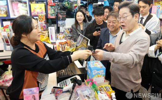 [경주=뉴스핌] 최지환 기자 = '골목골목 경청투어'에 나선 이재명 더불어민주당 대선후보가 9일 오전 경북 경주시 황남초등학교 인근 문구점을 찾아 상인과 인사를 나누고 있다. 2025.05.09 choipix16@newspim.com