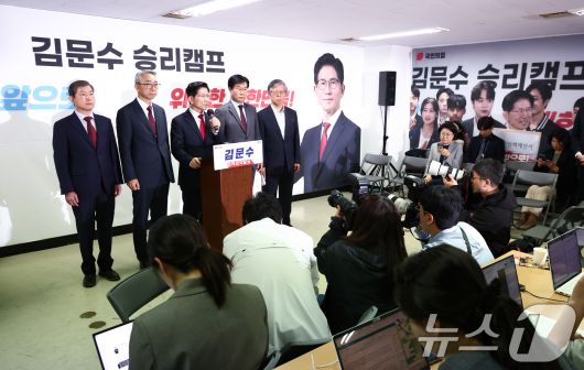 (서울=뉴스1) 김민지 기자 = 김문수 국민의힘 대통령 후보가 9일 오전 서울 여의도 선거사무소에서 북핵 억제력 강화 공약 발표를 하고 있다. 2025.5.9/뉴스1
