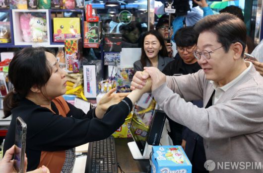 문구점 상인 손 잡아주는 이재명 후보
