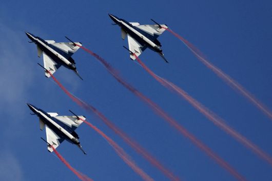 중국 인민해방군 젠(J)-10C 전투기들이 2015년 11월 24일 태국 나콘랏차시마 주의 코랏 공군기지에서 열린 언론 시연 행사 중 곡예 비행을 하고 있다./로이터 연합뉴스 |