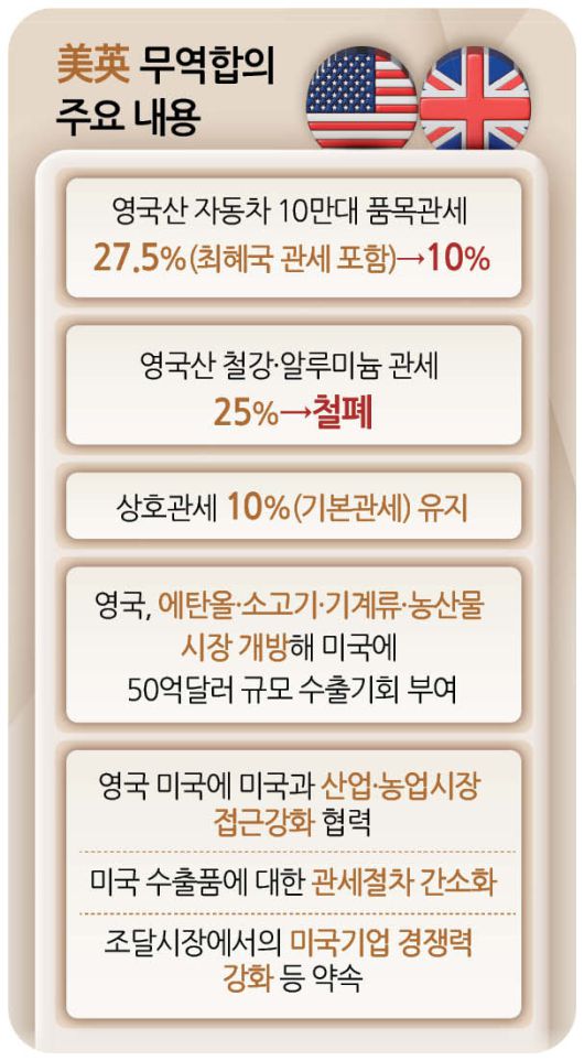 ▶일반 무역협정 아닌 ‘기본합의’…세부내용 없어 불확실성 여전=미국은 영국산 철강·알루미늄에 대한 25% 관세도 조정하기로 했다. 다만 영국 정부는 해당 관세가 철폐될 것이라고 발표해 미국과 입장 차이를 보였다. 대신 영국은 미국에 에탄올, 소고기, 기계류, 농산물에 대한 시장을 개방하기로 했다.