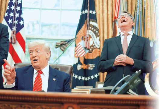 도널드 트럼프(왼쪽) 미국 대통령이 8일(현지시간) 미 워싱턴 D.C. 백악관의 오벌 오피스에서 미국과 영국 간의 무역 협정을 발표한 뒤 언론과 재치있는 문답을 주고받자 피터 맨델슨 주미 영국대사가 크게 웃으며 호응했다. [AP] |