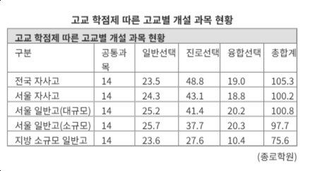 종로학원이 분석한 각 학교의 과목을 살펴보면, 대체적으로 전체 과목수에서 진로, 융합선택 과목 비중이 많게는 60~70%, 적게는 50% 편성한 것으로 나타났다.