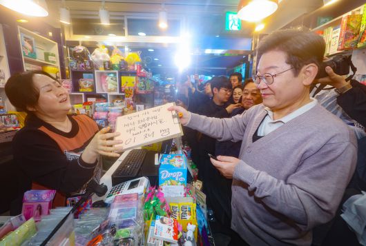 이재명 더불어민주당 대선 후보가 제3차 골목골목 경청투어로 경북지역 방문에 나선 9일 경북 경주시의 한 문방구를 방문해 가게 상인에게 자필 서명한 종이를 건네주고 있다. [연합] |