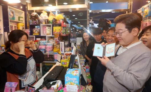 이재명 더불어민주당 대선 후보가 9일 경북 경주시의 한 문방구를 방문했다. 연합뉴스 |