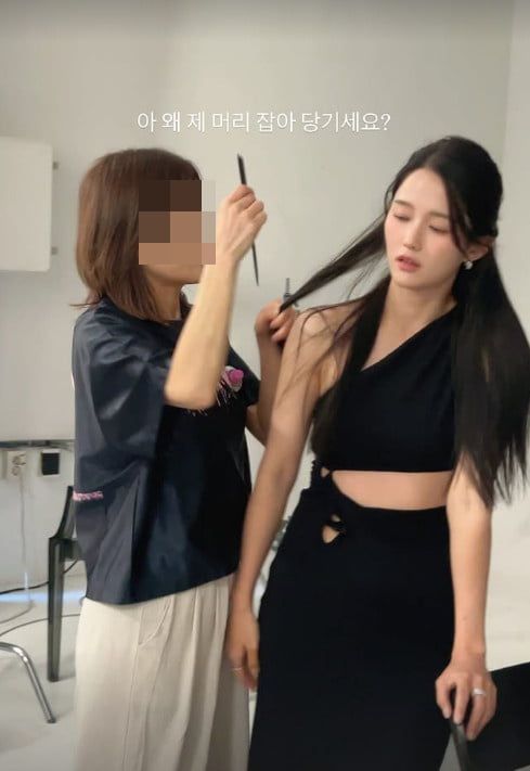 공개된 사진 속에는 여성 스태프가 남보라의 한쪽 머리를 당긴 채 헤어 스타일을 정리해 주고 있는 모습. 특히 포착된 남보라의 표정까지 절묘해 남보라는 이를 활용해 불쾌함을 드러내는 상황극을 재현해 보는 이들의 웃음을 자아냈다.