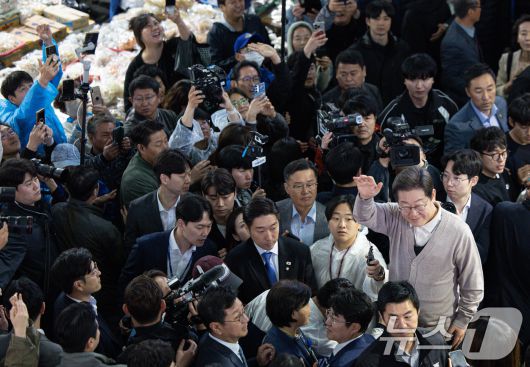 (영천=뉴스1) 이재명 기자 = 3차 경청투어에 나선 이재명 더불어민주당 대통령 후보가 9일 오전 경북 영천시완산동 영천공설시장에서 연설하기 전 인사하고 있다. 2025.5.9/뉴스12expulsion@news1.krCopyright ⓒ 뉴스1. All rights reserved. 무단 전재 및 재배포, AI학습 이용 금지.
