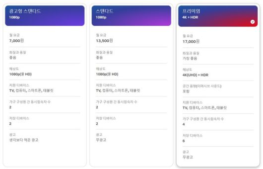 이번 가격 인상은 각 요금제의 한국 출시 이후 처음으로 단행된다. 스탠다드와 프리미엄 요금제는 기존 가격이 유지된다. 기존 계정에 추가금을 내고 프로필을 추가하던 '추가 회원'과 '광고형 추가 회원' 가격도 그대로다. 동시 시청 기기, FHD 화질 제공 등 서비스 변화도 없다.