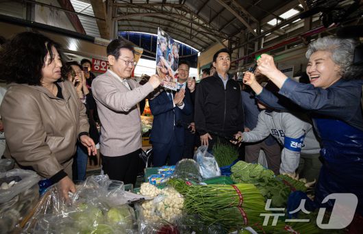 (영천=뉴스1) 이재명 기자 = 3차 경청투어에 나선 이재명 더불어민주당 대통령 후보가 9일 오전 경북 영천시완산동 영천공설시장에서 한 상인 요청으로 사인한 후 들어보이고 있다. 2025.5.9/뉴스12expulsion@news1.krCopyright ⓒ 뉴스1. All rights reserved. 무단 전재 및 재배포, AI학습 이용 금지.