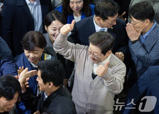 (영천=뉴스1) 이재명 기자 = 3차 경청투어에 나선 이재명 더불어민주당 대통령 후보가 9일 오전 경북 영천시완산동 영천공설시장에서 시민들에게 인사하고 있다. 2025.5.9/뉴스1