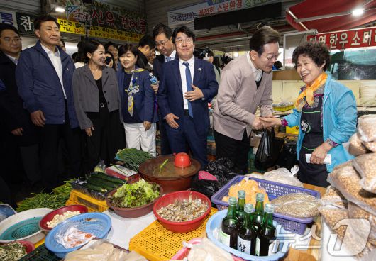 (영천=뉴스1) 이재명 기자 = 3차 경청투어에 나선 이재명 더불어민주당 대통령 후보가 9일 오전 경북 영천시완산동 영천공설시장에서 상품을 구입한 후 상인과 인사하고 있다. 2025.5.9/뉴스12expulsion@news1.krCopyright ⓒ 뉴스1. All rights reserved. 무단 전재 및 재배포, AI학습 이용 금지.