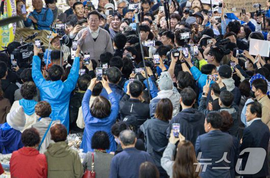 (영천=뉴스1) 이재명 기자 = 3차 경청투어에 나선 이재명 더불어민주당 대통령 후보가 9일 오전 경북 영천시완산동 영천공설시장에서 연설을 하고 있다. 2025.5.9/뉴스1