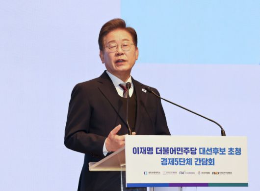 ▲더불어민주당 이재명 대선후보가 8일 서울 중구 대한상공회의소에서 열린 대선후보 초청 경제5단체 간담회에서 인사말을 하고 있다. ⓒ연합뉴스 |