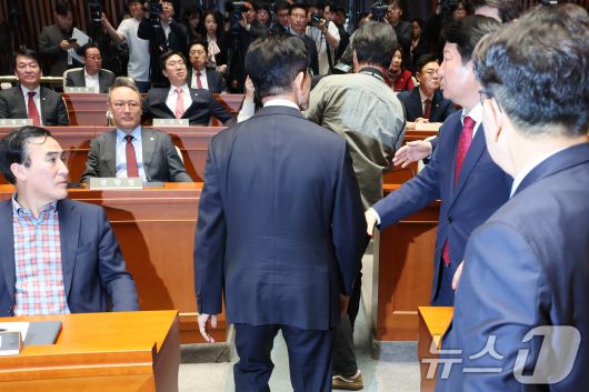 (서울=뉴스1) 안은나 기자 = 김문수 국민의힘 대통령 후보가 9일 서울 여의도 국회에서 열린 의원총회에서 "무소속을 당 후보 만들려 불법부당 수단 동원, 중단하라"며 입장을 밝힌 뒤 의총장을 떠나자 권영진 의원 등이 이를 말리고 있다. 2025.5.9/뉴스1