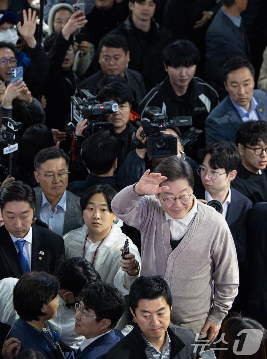 (영천=뉴스1) 이재명 기자 = 3차 경청투어에 나선 이재명 더불어민주당 대통령 후보가 9일 오전 경북 영천시완산동 영천공설시장에서 연설을 하기 전 인사하고 있다. 2025.5.9/뉴스12expulsion@news1.krCopyright ⓒ 뉴스1. All rights reserved. 무단 전재 및 재배포, AI학습 이용 금지.
