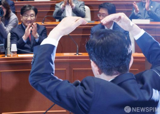 [서울=뉴스핌] 윤창빈 기자 = 김문수 국민의힘 대선 후보가 9일 오전 서울 여의도 국회에서 열린 의원총회에서 발언을 하던 중 머리위로 하트를 그리고 있다. 2025.05.09 pangbin@newspim.com |