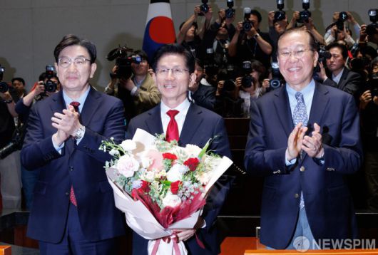 [서울=뉴스핌] 윤창빈 기자 = 김문수 국민의힘 대선 후보가 9일 오전 서울 여의도 국회에서 열린 의원총회에 참석하며 권영세 비상대책위원장, 권성동 원내대표에게 꽃다발을 받고 있다. 2025.05.09 pangbin@newspim.com