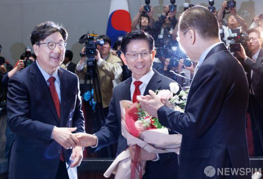 [서울=뉴스핌] 윤창빈 기자 = 김문수 국민의힘 대선 후보가 9일 오전 서울 여의도 국회에서 열린 의원총회에 참석하며 권영세 비상대책위원장, 권성동 원내대표에게 꽃다발을 받고 있다. 2025.05.09 pangbin@newspim.com