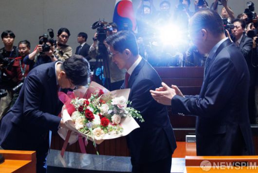 [서울=뉴스핌] 윤창빈 기자 = 김문수 국민의힘 대선 후보가 9일 오전 서울 여의도 국회에서 열린 의원총회에 참석하며 권영세 비상대책위원장, 권성동 원내대표에게 꽃다발을 받고 있다. 2025.05.09 pangbin@newspim.com