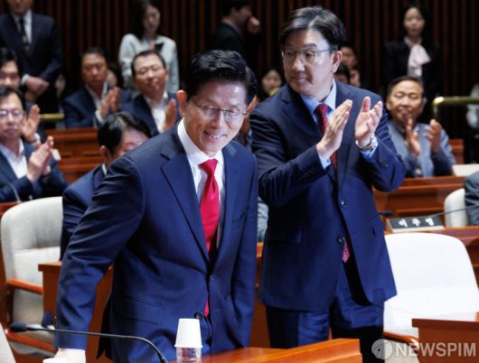 [서울=뉴스핌] 윤창빈 기자 = 김문수 국민의힘 대선 후보가 9일 오전 서울 여의도 국회에서 열린 의원총회에 참석하며 의원들의 박수를 받고 있다. 2025.05.09 pangbin@newspim.com |
