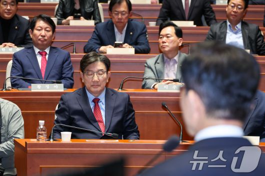 (서울=뉴스1) 안은나 기자 = 김문수 국민의힘 대통령 후보가 9일 서울 여의도 국회에서 열린 의원총회에서 지도부를 향해 "무소속을 당 후보 만들려 불법부당 수단 동원, 중단하라"며 입장을 밝히는 가운데 권성동 원내대표가 눈을 감고 있다. 2025.5.9/뉴스1