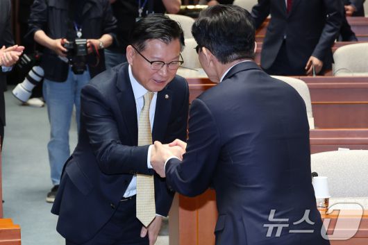 (서울=뉴스1) 안은나 기자 = 김문수 국민의힘 대통령 후보가 9일 서울 여의도 국회에서 열린 의원총회에 입장하며 이양수 선관위원장과 악수하고 있다. 김 후보는 지도부를 향해 "무소속을 당 후보 만들려 불법부당 수단 동원, 중단하라"며 입장을 밝힌 뒤 의총장을 떠났다. 2025.5.9/뉴스1