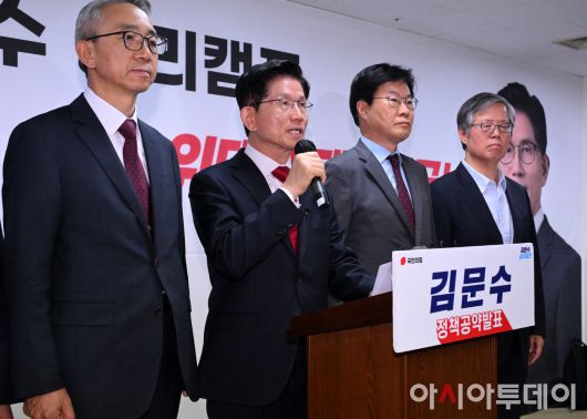 아시아투데이 송의주 기자 = 김문수 국민의힘 대선 후보가 9일 서울 여의도 선거사무소에서 북핵 억제력 강화 공약 발표를 하고 있다.