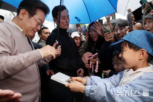 [경주=뉴시스] 조성우 기자 = 민심을 청취하는 '경청 투어'에 나선 이재명 더불어민주당 대선후보가 9일 경북 경주시 용강동 아파트단지 인근에서 자신의 책 '결국 국민의 합니다'를 가져온 한 어린의 사인 요청을 받고 있다. 2025.05.09. xconfind@newsis.com |