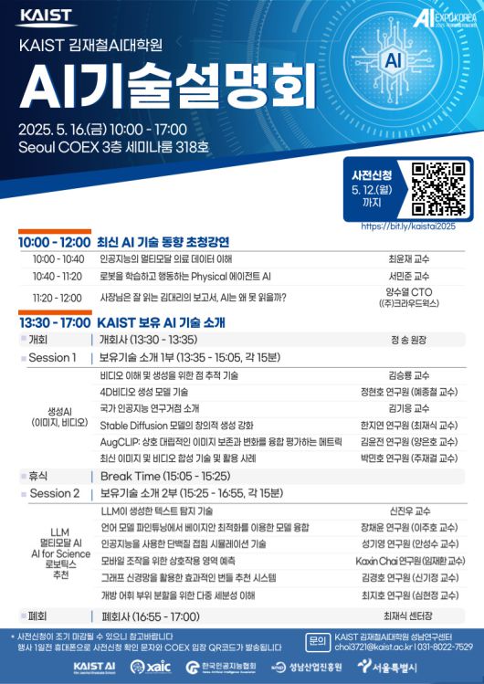 최윤재·서민준 김재철AI대학원 교수와 양수열 크라우드웍스 CTO 등 국내 AI분야 전문가들이 참석해 의료AI, 로보틱스 등 최신 기술동향을 주제로 강연을 진행한다. 이번 설명회는 누구나 무료로 참석가능하며 오는 12일까지 온라인(https://bit.ly/kaistai2025)으로 신청하면 된다.