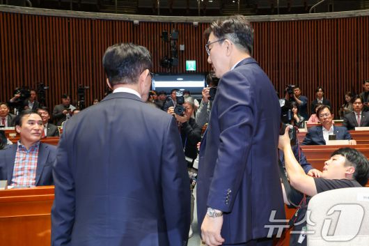 (서울=뉴스1) 안은나 기자 = 김문수 국민의힘 대통령 후보가 9일 서울 여의도 국회에서 열린 의원총회에서 지도부를 향해 "무소속을 당 후보 만들려 불법부당 수단 동원, 중단하라"며 입장을 밝힌 뒤 의총장을 떠나고 있다. 오른쪽은 권성동 원내대표. 2025.5.9/뉴스1