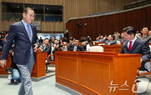 (서울=뉴스1) 안은나 기자 = 김문수 국민의힘 대통령 후보가 9일 서울 여의도 국회에서 열린 의원총회에서 지도부를 향해 "무소속을 당 후보 만들려 불법부당 수단 동원, 중단하라"며 입장을 밝히자 권영세 비대위원장이 "대단히 실망스럽다"고 발언한 뒤 의총장을 떠나고 있다. 2025.5.9/뉴스1