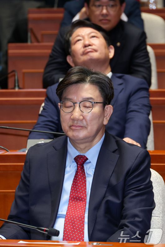 (서울=뉴스1) 안은나 기자 = 김문수 국민의힘 대통령 후보가 9일 서울 여의도 국회에서 열린 의원총회에서 지도부를 향해 "무소속을 당 후보 만들려 불법부당 수단 동원, 중단하라"며 입장을 밝히자 권성동 원내대표가 눈을 감고 있다. 2025.5.9/뉴스1