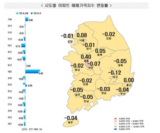 세종이 크게 오르고 5대광역시(-0.07%→-0.06%)와 8개 도(-0.05%→-0.02%)의 하락폭이 축소되면서 지방(-0.05%→-0.03%)은 하락폭 축소됐다.