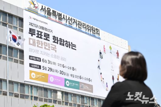 서울 종로구 서울시선거관리위원회 청사 외벽에 제21대 대통령 선거 대형 홍보 현수막이 게시된 모습. 류영주 기자 |