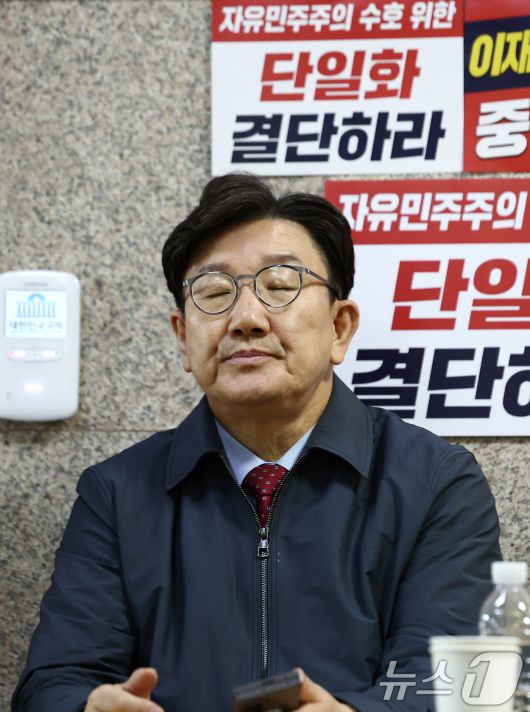 (서울=뉴스1) 김민지 기자 = 김문수 국민의힘 대통령 후보에게 단일화 약속을 촉구하며 단식농성 중인 권성동 원내대표가 9일 오후 서울 여의도 원내대표실 앞 농성장에서 굳은 표정을 하고 있다. 2025.5.9/뉴스1