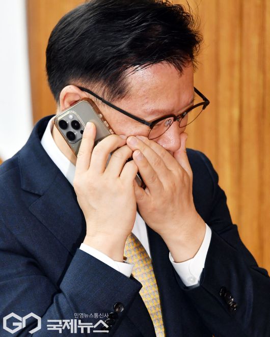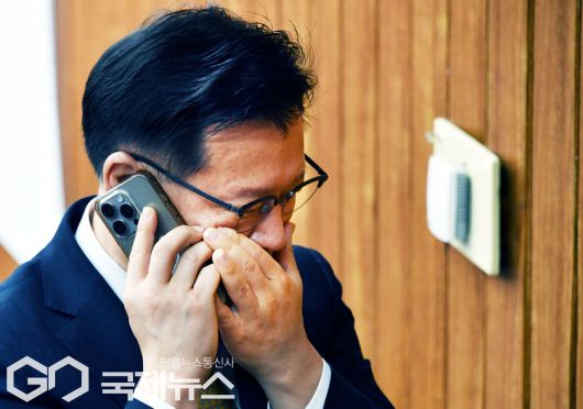 (서울=국제뉴스) 국민의힘 선관위원장에 위촉된 이양수 사무총장이 9일 오전 서울 여의도 국회에서 열린 원내대책회의에 참석해 통화하고 있다./사진=이용우 기자