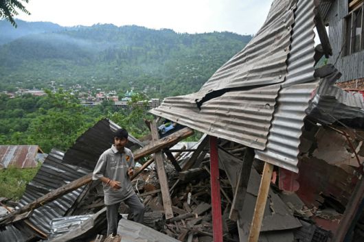 인도령 잠무 카슈미르의 스리나가르에서 약 100km 떨어진 우리 지역의 라가마 마을에서 한 지역 주민이 파키스탄의 포격으로 파괴된 자신의 집 잔해를 살펴보고 있다. (사진=AFP) |