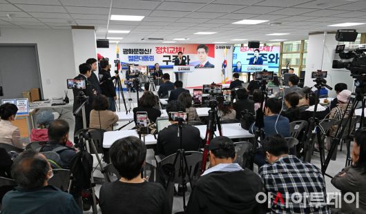 아시아투데이 송의주 기자 = 구주와 자유통일당 대선 후보가 9일 서울 여의도 당사에서 열린 기자회견에서 발언을 하고 있다.