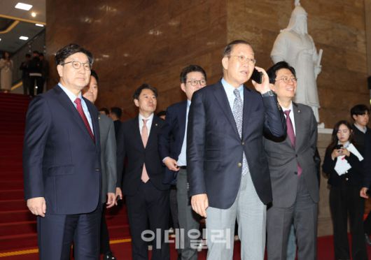 [이데일리 노진환 기자] 권영세 국민의힘 비상대책위원장과 권성동 원내대표가 9일 서울 여의도 국회에서 의원총회에 참석 예정인 김문수 대선 후보를 기다리고 있다.